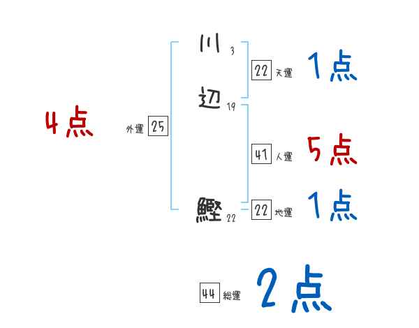天運![]() | 川辺鰹さんの天運は22画の1つ星!努力することが苦手ないっぽう手先が器用。芸術性にも優れる。 家系が持つ宿命的な運勢を表します。祖先から受け継いだ苗字ですので自分の力が及びません。家柄を象徴します。 |