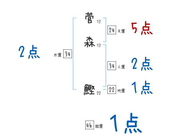 天運![]() | 菅森鰹さんの天運は24画の5つ星!家庭運が良く順調な人生。金運にも恵まれる。 家系が持つ宿命的な運勢を表します。祖先から受け継いだ苗字ですので自分の力が及びません。家柄を象徴します。 |