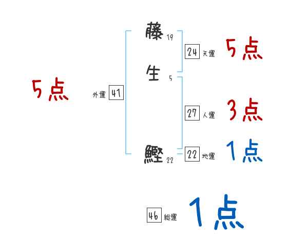 天運![]() | 藤生鰹さんの天運は24画の5つ星!家庭運が良く順調な人生。金運にも恵まれる。 家系が持つ宿命的な運勢を表します。祖先から受け継いだ苗字ですので自分の力が及びません。家柄を象徴します。 |