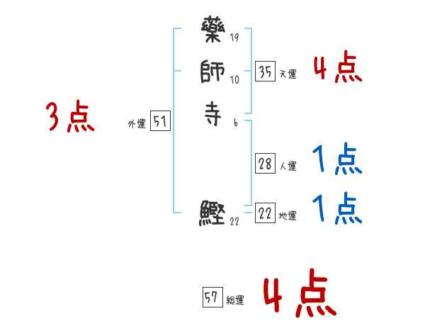 天運![]() | 藥師寺鰹さんの天運は35画の4つ星!温厚な性格で感受性が高い。穏和な性格で人望が厚い。 家系が持つ宿命的な運勢を表します。祖先から受け継いだ苗字ですので自分の力が及びません。家柄を象徴します。 |