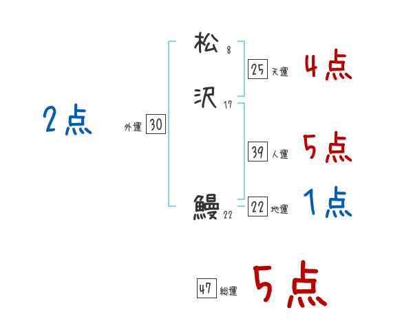 天運![]() | 松沢鰻さんの天運は25画の4つ星!個性があり才能があふれる。強運の持ち主で発展する。 家系が持つ宿命的な運勢を表します。祖先から受け継いだ苗字ですので自分の力が及びません。家柄を象徴します。 |