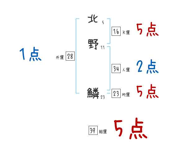 総運![]() | 北野鱗さんの総運は39画の5つ星!社交性に優れ人望が厚い。人の上に立ち成功する。 あなたの人生を表す1番重要な運勢です。生涯を通じて影響する総合運となり、主に50歳以降の晩年期に影響を及ぼします。 |