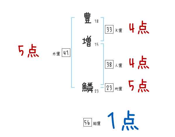 総運![]() | 豊増鱗さんの総運は56画の1つ星!消極的で無気力になりがち。誠実な気持ちが必要でしょう。 あなたの人生を表す1番重要な運勢です。生涯を通じて影響する総合運となり、主に50歳以降の晩年期に影響を及ぼします。 |