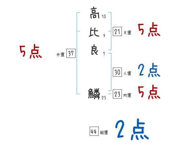 外運![]() | 高比良鱗さんの外運は37画の5つ星!努力家で順応性に優れる。現実的な考え方ができ忠実に物事をこなす。 生活面を象徴する運勢です。外部から受ける影響力を表し、結婚運、家庭運や職場、環境への順応性を表します。 |