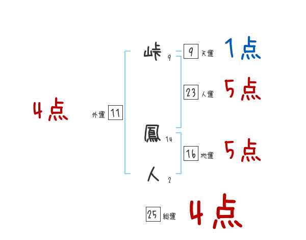 天運![]() | 峠鳳人さんの天運は9画の1つ星!消極的で才能を発揮することが苦手なことも。周りの意見に耳を傾けましょう。 家系が持つ宿命的な運勢を表します。祖先から受け継いだ苗字ですので自分の力が及びません。家柄を象徴します。 |