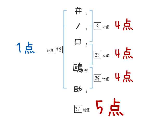 総運![]() | 井ノ口鴎助さんの総運は37画の5つ星!努力家で順応性に優れる。現実的な考え方ができ忠実に物事をこなす。 あなたの人生を表す1番重要な運勢です。生涯を通じて影響する総合運となり、主に50歳以降の晩年期に影響を及ぼします。 |