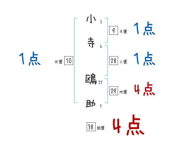 天運![]() | 小寺鴎助さんの天運は9画の1つ星!消極的で才能を発揮することが苦手なことも。周りの意見に耳を傾けましょう。 家系が持つ宿命的な運勢を表します。祖先から受け継いだ苗字ですので自分の力が及びません。家柄を象徴します。 |