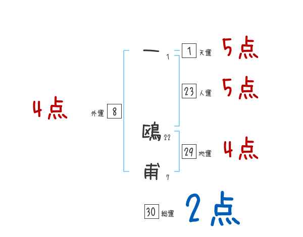 人運![]() | 一鴎甫さんの人運は23画の5つ星!想像力に優れ活力がある。一代で成功し名誉を手に入れる。 性格や才能などを表す2番目に重要な運勢です。人間関係や協調性、社会的な成功に影響します。主に20歳から50歳ぐらいまでの中年期の運勢を表します。 |