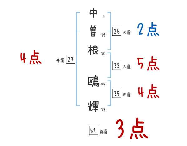 人運![]() | 中曽根鴎輝さんの人運は32画の5つ星!柔軟性があり成功する。チャンスが多く金運が良い。 性格や才能などを表す2番目に重要な運勢です。人間関係や協調性、社会的な成功に影響します。主に20歳から50歳ぐらいまでの中年期の運勢を表します。 |