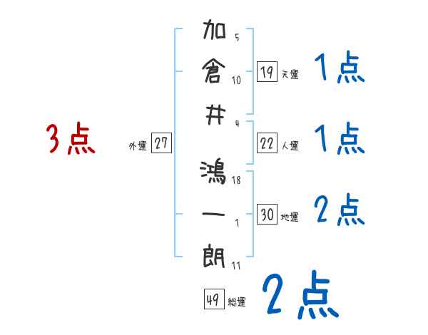 人運![]() | 加倉井鴻一朗さんの人運は22画の1つ星!努力することが苦手ないっぽう手先が器用。芸術性にも優れる。 性格や才能などを表す2番目に重要な運勢です。人間関係や協調性、社会的な成功に影響します。主に20歳から50歳ぐらいまでの中年期の運勢を表します。 |