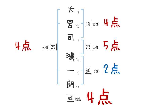 人運![]() | 大宮司鴻一朗さんの人運は23画の5つ星!想像力に優れ活力がある。一代で成功し名誉を手に入れる。 性格や才能などを表す2番目に重要な運勢です。人間関係や協調性、社会的な成功に影響します。主に20歳から50歳ぐらいまでの中年期の運勢を表します。 |