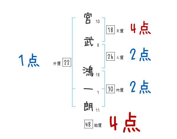 天運![]() | 宮武鴻一朗さんの天運は18画の4つ星!情熱的で剛気。忍耐力があり信頼される。 家系が持つ宿命的な運勢を表します。祖先から受け継いだ苗字ですので自分の力が及びません。家柄を象徴します。 |