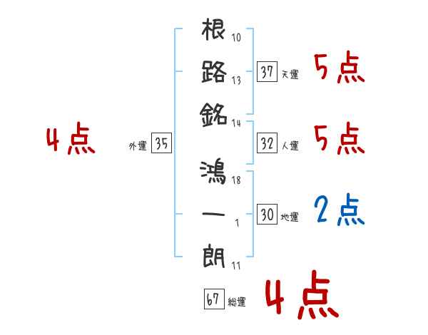 外運![]() | 根路銘鴻一朗さんの外運は35画の4つ星!温厚な性格で感受性が高い。穏和な性格で人望が厚い。 生活面を象徴する運勢です。外部から受ける影響力を表し、結婚運、家庭運や職場、環境への順応性を表します。 |