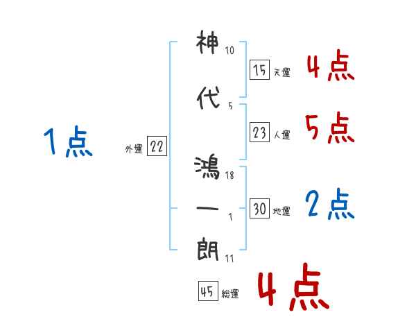外運![]() | 神代鴻一朗さんの外運は22画の1つ星!努力することが苦手ないっぽう手先が器用。芸術性にも優れる。 生活面を象徴する運勢です。外部から受ける影響力を表し、結婚運、家庭運や職場、環境への順応性を表します。 |