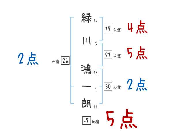 人運![]() | 緑川鴻一朗さんの人運は21画の5つ星!統率力がある。独立し成功する。名誉を手に入れる。 性格や才能などを表す2番目に重要な運勢です。人間関係や協調性、社会的な成功に影響します。主に20歳から50歳ぐらいまでの中年期の運勢を表します。 |