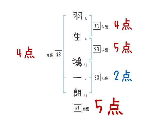 天運![]() | 羽生鴻一朗さんの天運は11画の4つ星!着実に富や地位を得る幸運な人生。 家系が持つ宿命的な運勢を表します。祖先から受け継いだ苗字ですので自分の力が及びません。家柄を象徴します。 |
