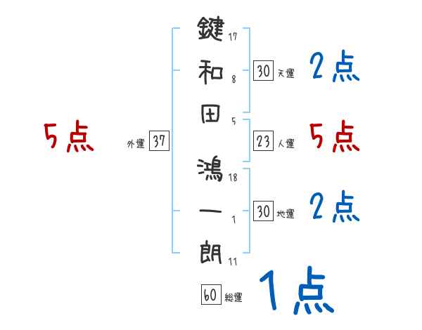 外運![]() | 鍵和田鴻一朗さんの外運は37画の5つ星!努力家で順応性に優れる。現実的な考え方ができ忠実に物事をこなす。 生活面を象徴する運勢です。外部から受ける影響力を表し、結婚運、家庭運や職場、環境への順応性を表します。 |