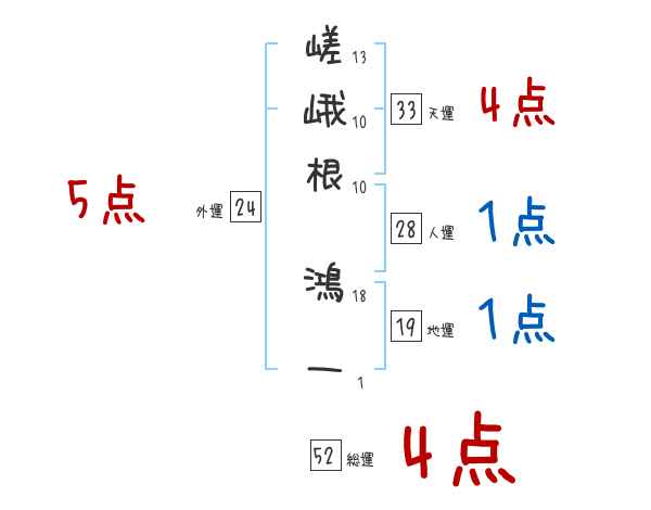 天運![]() | 嵯峨根鴻一さんの天運は33画の4つ星!権力志向でプライドが高い。勇気があり運を切り開き成功する。 家系が持つ宿命的な運勢を表します。祖先から受け継いだ苗字ですので自分の力が及びません。家柄を象徴します。 |