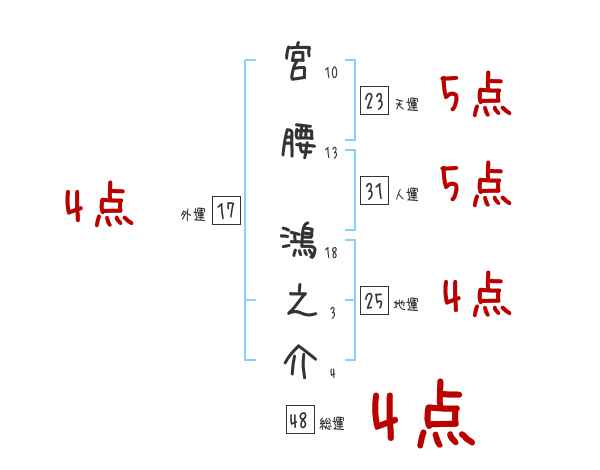 天運![]() | 宮腰鴻之介さんの天運は23画の5つ星!想像力に優れ活力がある。一代で成功し名誉を手に入れる。 家系が持つ宿命的な運勢を表します。祖先から受け継いだ苗字ですので自分の力が及びません。家柄を象徴します。 |