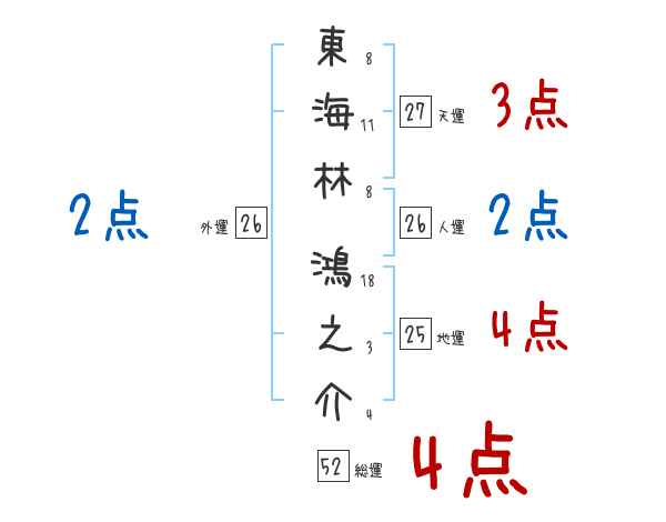 総運![]() | 東海林鴻之介さんの総運は52画の4つ星!先見性と独創性に優れ考える力がある。強運の持ち主。 あなたの人生を表す1番重要な運勢です。生涯を通じて影響する総合運となり、主に50歳以降の晩年期に影響を及ぼします。 |