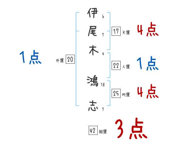 人運![]() | 伊尾木鴻志さんの人運は22画の1つ星!努力することが苦手ないっぽう手先が器用。芸術性にも優れる。 性格や才能などを表す2番目に重要な運勢です。人間関係や協調性、社会的な成功に影響します。主に20歳から50歳ぐらいまでの中年期の運勢を表します。 |