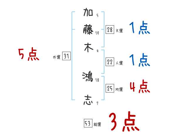 総運![]() | 加藤木鴻志さんの総運は53画の3つ星!やや見栄っ張りで虚栄心がある。散財に注意。 あなたの人生を表す1番重要な運勢です。生涯を通じて影響する総合運となり、主に50歳以降の晩年期に影響を及ぼします。 |