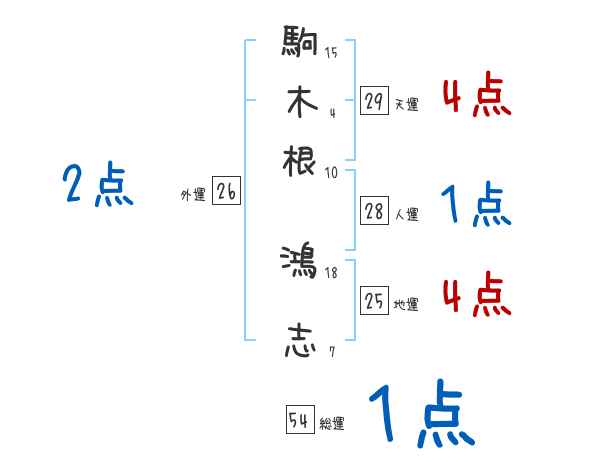 総運![]() | 駒木根鴻志さんの総運は54画の1つ星!トラブルが多いかも。周りをよく見て協調して過ごしましょう。 あなたの人生を表す1番重要な運勢です。生涯を通じて影響する総合運となり、主に50歳以降の晩年期に影響を及ぼします。 |