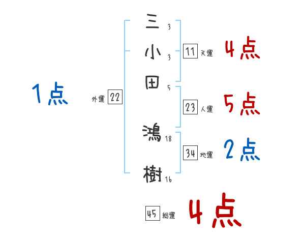 天運![]() | 三小田鴻樹さんの天運は11画の4つ星!着実に富や地位を得る幸運な人生。 家系が持つ宿命的な運勢を表します。祖先から受け継いだ苗字ですので自分の力が及びません。家柄を象徴します。 |