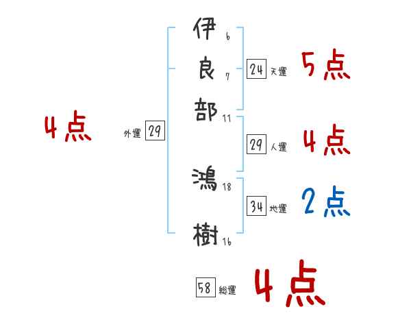 総運![]() | 伊良部鴻樹さんの総運は58画の4つ星!安定した生活。大器晩成タイプ。 あなたの人生を表す1番重要な運勢です。生涯を通じて影響する総合運となり、主に50歳以降の晩年期に影響を及ぼします。 |