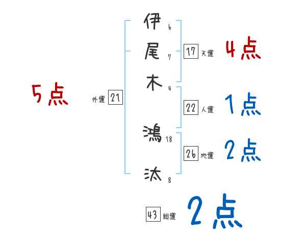 外運![]() | 伊尾木鴻汰さんの外運は21画の5つ星!統率力がある。独立し成功する。名誉を手に入れる。 生活面を象徴する運勢です。外部から受ける影響力を表し、結婚運、家庭運や職場、環境への順応性を表します。 |