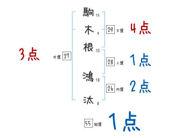 天運![]() | 駒木根鴻汰さんの天運は29画の4つ星!完全主義で才能がある。厳格な心の持ち主。 家系が持つ宿命的な運勢を表します。祖先から受け継いだ苗字ですので自分の力が及びません。家柄を象徴します。 |