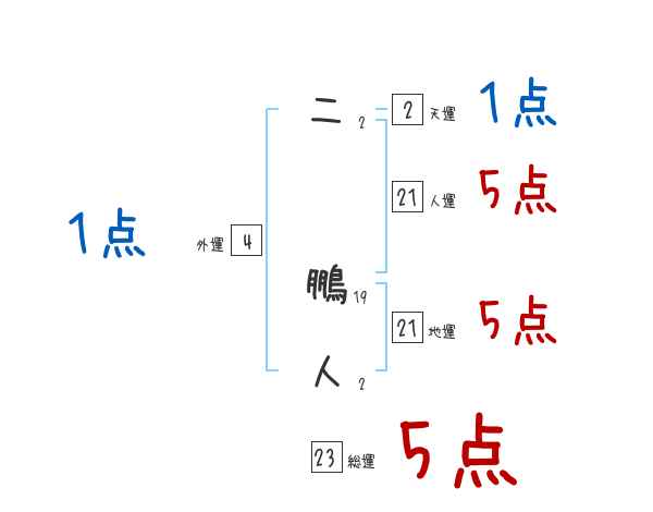 人運![]() | 二鵬人さんの人運は21画の5つ星!統率力がある。独立し成功する。名誉を手に入れる。 性格や才能などを表す2番目に重要な運勢です。人間関係や協調性、社会的な成功に影響します。主に20歳から50歳ぐらいまでの中年期の運勢を表します。 |