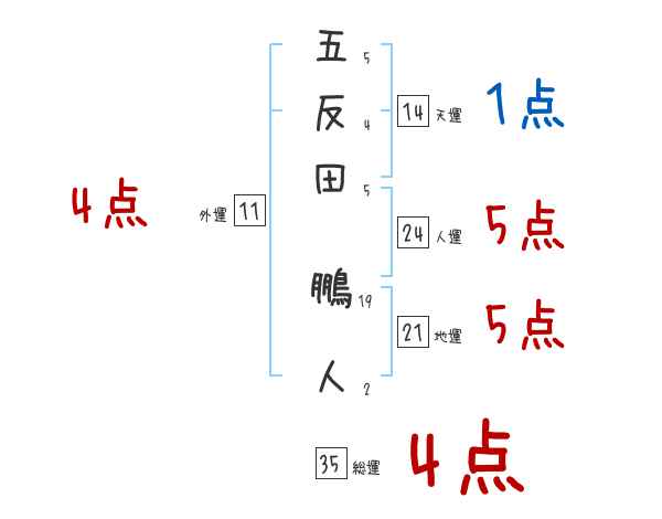 人運![]() | 五反田鵬人さんの人運は24画の5つ星!家庭運が良く順調な人生。金運にも恵まれる。 性格や才能などを表す2番目に重要な運勢です。人間関係や協調性、社会的な成功に影響します。主に20歳から50歳ぐらいまでの中年期の運勢を表します。 |