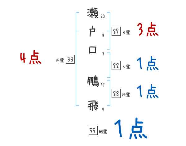 外運![]() | 瀬戸口鵬飛さんの外運は33画の4つ星!権力志向でプライドが高い。勇気があり運を切り開き成功する。 生活面を象徴する運勢です。外部から受ける影響力を表し、結婚運、家庭運や職場、環境への順応性を表します。 |