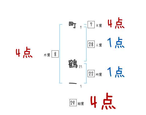 天運![]() | 町鶴一さんの天運は7画の4つ星!強い意志や信念を持ち独立心が強い。自立する。 家系が持つ宿命的な運勢を表します。祖先から受け継いだ苗字ですので自分の力が及びません。家柄を象徴します。 |