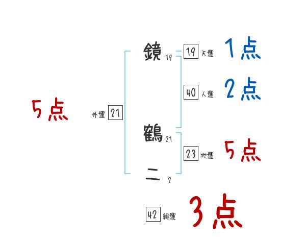 地運![]() | 鏡鶴二さんの地運は23画の5つ星!想像力に優れ活力がある。一代で成功し名誉を手に入れる。 個性を表す基礎的な運勢です。性格形成や対人関係、行動力など家庭環境に影響されます。主に誕生してから20歳くらいまでの若年期の運勢を表します。 |