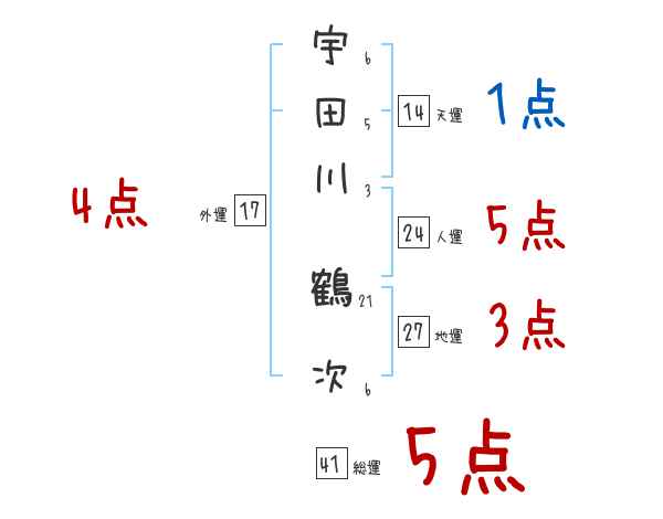 外運![]() | 宇田川鶴次さんの外運は17画の4つ星!積極的な行動力。地位を気づき財産を手に入れる。純粋な心と直感力。 生活面を象徴する運勢です。外部から受ける影響力を表し、結婚運、家庭運や職場、環境への順応性を表します。 |