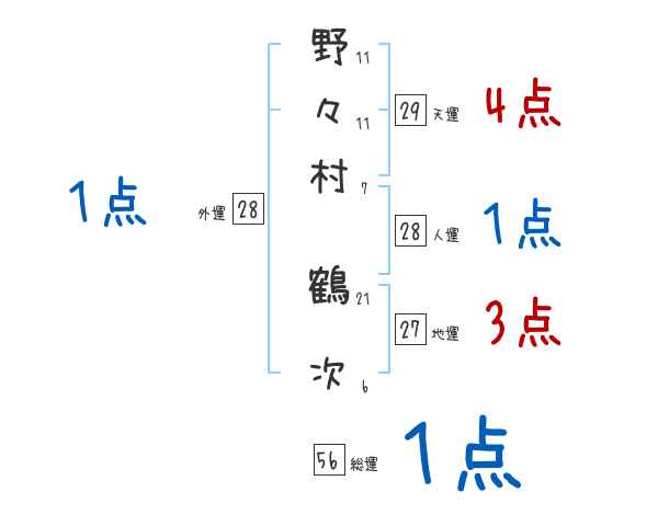 天運![]() | 野々村鶴次さんの天運は29画の4つ星!完全主義で才能がある。厳格な心の持ち主。 家系が持つ宿命的な運勢を表します。祖先から受け継いだ苗字ですので自分の力が及びません。家柄を象徴します。 |
