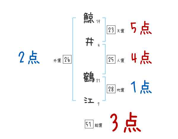 外運![]() | 鯨井鶴江さんの外運は26画の2つ星!波瀾万丈かも。信頼できる人を大事にしましょう。 生活面を象徴する運勢です。外部から受ける影響力を表し、結婚運、家庭運や職場、環境への順応性を表します。 |