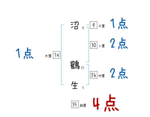 天運![]() | 沼鶴生さんの天運は9画の1つ星!消極的で才能を発揮することが苦手なことも。周りの意見に耳を傾けましょう。 家系が持つ宿命的な運勢を表します。祖先から受け継いだ苗字ですので自分の力が及びません。家柄を象徴します。 |