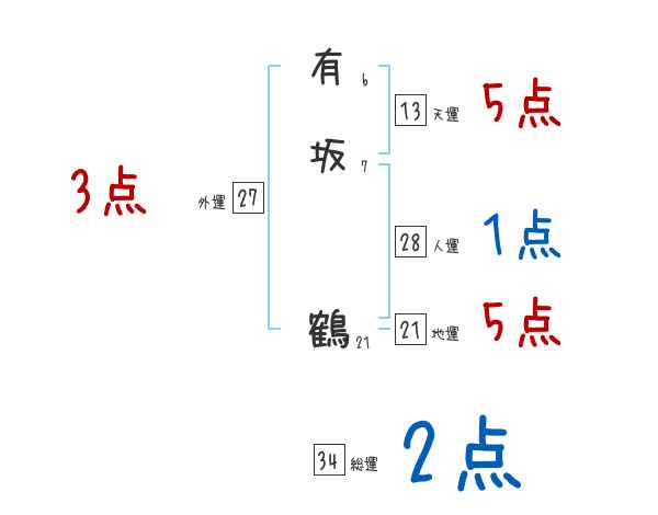 天運![]() | 有坂鶴さんの天運は13画の5つ星!才能に恵まれ人気がある。名声を手に入れる。円満な人生。 家系が持つ宿命的な運勢を表します。祖先から受け継いだ苗字ですので自分の力が及びません。家柄を象徴します。 |