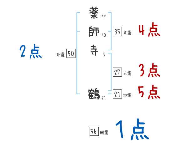外運![]() | 薬師寺鶴さんの外運は50画の2つ星!浮き沈みが激しく不安定。しりすぼみに衰退しやすいので注意しましょう。 生活面を象徴する運勢です。外部から受ける影響力を表し、結婚運、家庭運や職場、環境への順応性を表します。 |