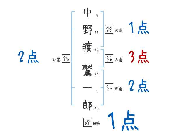 天運![]() | 中野渡鷲一郎さんの天運は28画の1つ星!家庭環境に注意。スポーツで活躍できる能力があるかも。 家系が持つ宿命的な運勢を表します。祖先から受け継いだ苗字ですので自分の力が及びません。家柄を象徴します。 |