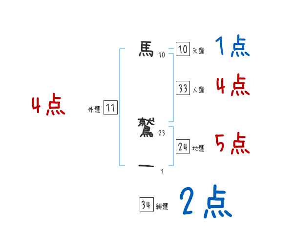 総運![]() | 馬鷲一さんの総運は34画の2つ星!独創性に優れるが、自尊心が強く災難に注意しましょう。 あなたの人生を表す1番重要な運勢です。生涯を通じて影響する総合運となり、主に50歳以降の晩年期に影響を及ぼします。 |