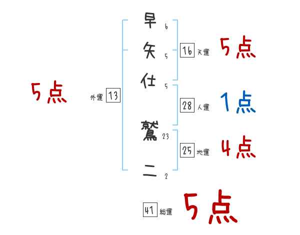 天運![]() | 早矢仕鷲二さんの天運は16画の5つ星!人望が厚く大きく発展する。逆転成功が見える。 家系が持つ宿命的な運勢を表します。祖先から受け継いだ苗字ですので自分の力が及びません。家柄を象徴します。 |