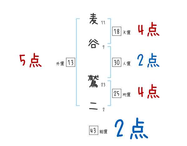 天運![]() | 麦谷鷲二さんの天運は18画の4つ星!情熱的で剛気。忍耐力があり信頼される。 家系が持つ宿命的な運勢を表します。祖先から受け継いだ苗字ですので自分の力が及びません。家柄を象徴します。 |