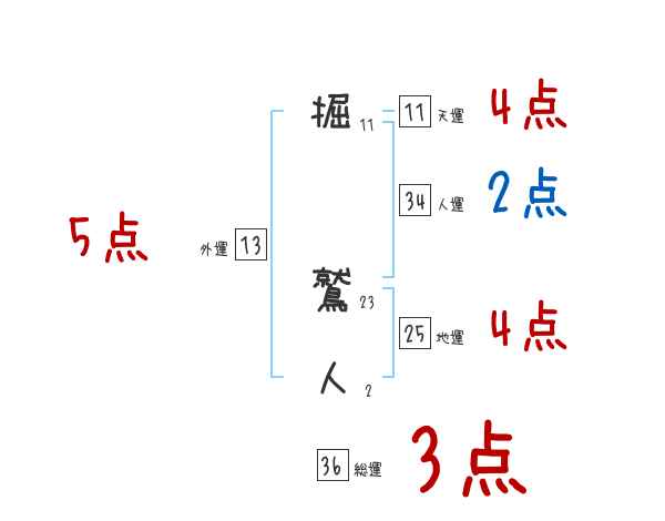 総運![]() | 掘鷲人さんの総運は36画の3つ星!先見性が豊かです。多少神経質で苦労することも。 あなたの人生を表す1番重要な運勢です。生涯を通じて影響する総合運となり、主に50歳以降の晩年期に影響を及ぼします。 |