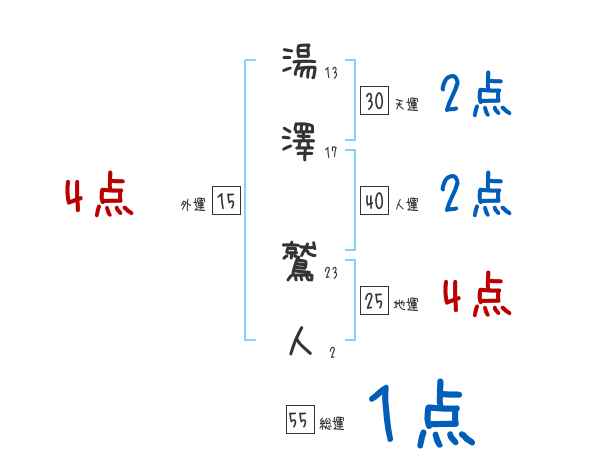 総運![]() | 湯澤鷲人さんの総運は55画の1つ星!欲張りな性格で軽率な行動に注意しましょう。病気に気をつけて。 あなたの人生を表す1番重要な運勢です。生涯を通じて影響する総合運となり、主に50歳以降の晩年期に影響を及ぼします。 |
