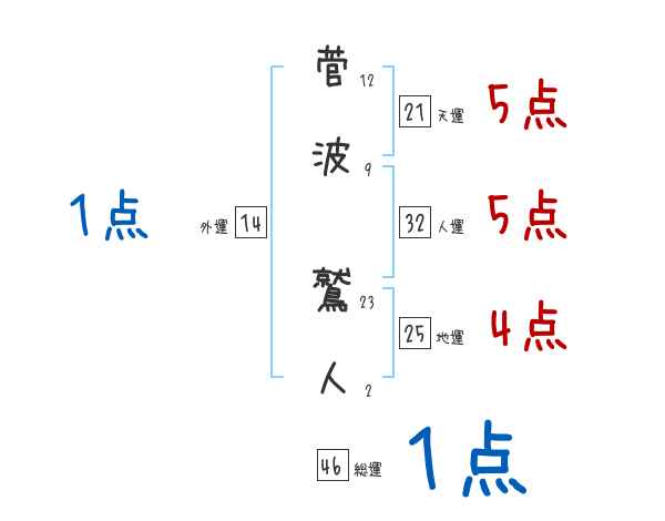 天運![]() | 菅波鷲人さんの天運は21画の5つ星!統率力がある。独立し成功する。名誉を手に入れる。 家系が持つ宿命的な運勢を表します。祖先から受け継いだ苗字ですので自分の力が及びません。家柄を象徴します。 |