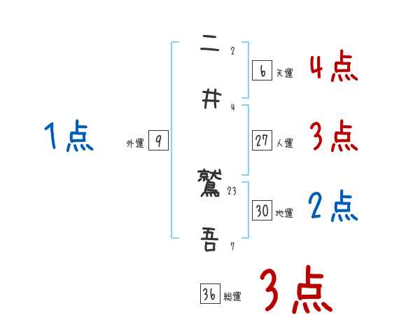 総運![]() | 二井鷲吾さんの総運は36画の3つ星!先見性が豊かです。多少神経質で苦労することも。 あなたの人生を表す1番重要な運勢です。生涯を通じて影響する総合運となり、主に50歳以降の晩年期に影響を及ぼします。 |